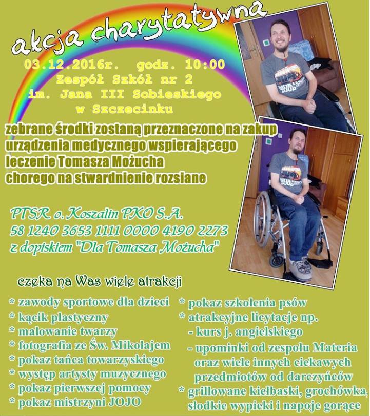 Choroba nie wybiera. Konieczność nierównej walki z przeciwnościami losu może się przytrafić każdemu. Wie o tym doskonale młody mieszkaniec Szczecinka – Tomek Możuch, który choruje na stwardnienie rozsiane. Szansą dla Tomka jest rehabilitacja przy pomocy specjalistycznego urządzenia. Jego zakup to koszt kilkunastu tysięcy zł. Osoby bliskie Tomkowi postanowiły działać i zebrać potrzebną sumę. W najbliższą sobotę (3 grudnia) organizują bogatą w przeróżne mikołajkowe atrakcje akcję charytatywną. Przyłączyć może się każdy!