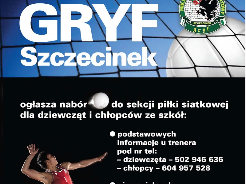 Miejski Klub Sportowy Gryf Szczecinek ogłasza nabór do sekcji siatkówki. Zgłaszać się mogą dziewczęta i chłopcy ze szkół podstawowych, gimnazjalnych i ponadgimnazjalnych. Bliższe informacja uzyskać można telefonicznie u trenerów poszczególnych grup. Szkoły podstawowe: dziewczęta nr tel. 502 946 636, chłopcy- 604 957 528; szkoły gimnazjalne i ponadgimnazjalne: dziewczęta- 604 458 254, chłopcy- 606 721 371. Można też dowiadywać się w hali sportowej OSiR przy ulicy Wiatracznej od poniedziałku do czwartku w godzinach 17.00 – 18.30, a także mailowo: [email protected]