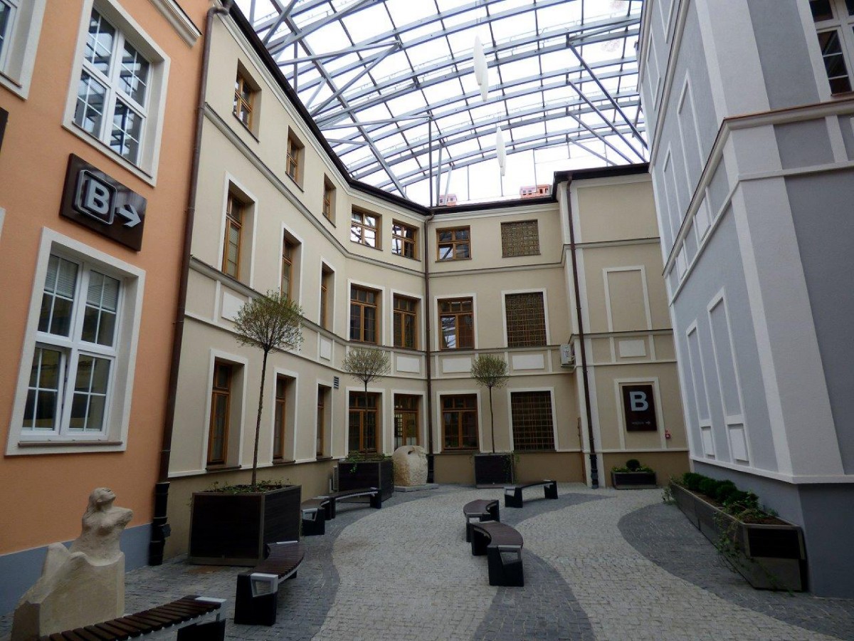 Zadaszony dziedziniec ratusza zyskał kolejny wystrój. Oprócz miejsc przeznaczonych do odpoczynku na dziedzińcu rosną już drzewa i niskopienne rośliny.