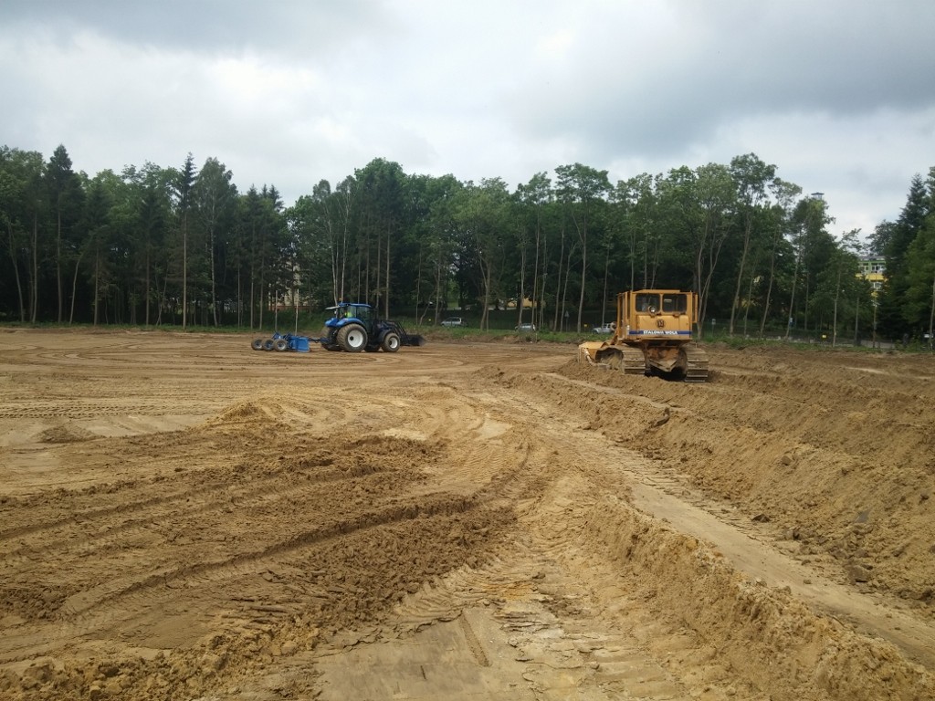 Oprócz spycharek, koparek i cięgników wywożących nadmiar ziemi, pojawiły się również równiarki laserowe, a to oznacza, że na dobre zaczęły się prace przy płycie boiska. Lada moment zacznie się etap związany z budową instalacji odwadniającej odprowadzającej wody gruntowe pochodzące z opadów atmosferycznych. Nastąpi przebudowa urządzeń melioracyjnych w zbiornik retencyjny, dzięki czemu „zebraną deszczówkę” będzie można wykorzystać do nawodnienia płyty boiska. W razie długotrwałej suszy woda będzie również dostarczana z istniejącej, znajdującej się nieopodal hydroforni.