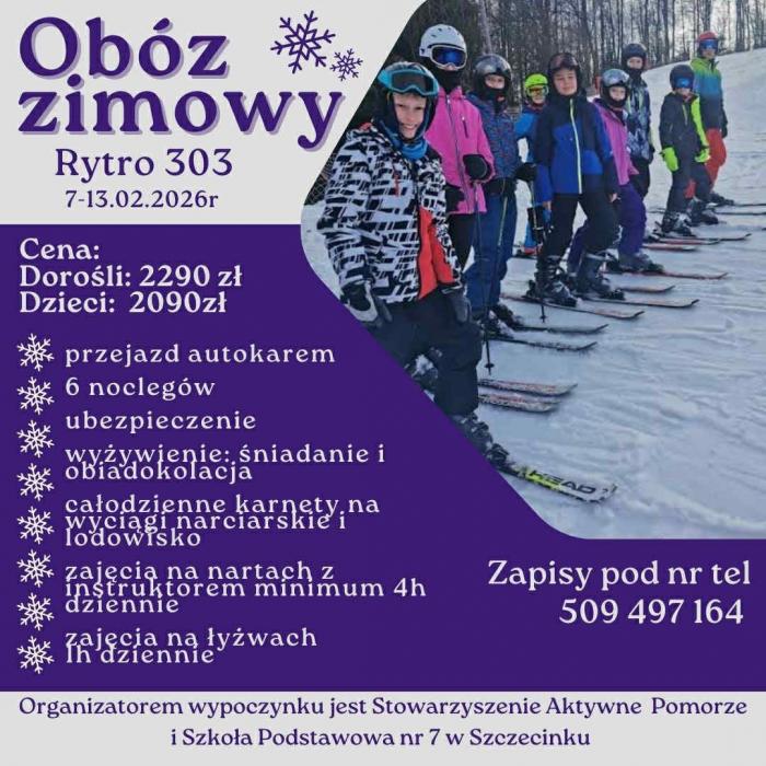 W dniach 7-13 lutego odbędzie się zimowy obóz “Rytro 303” w Małopolsce, który organizuje Stowarzyszenie Aktywne Pomorze i SP nr 7 w Szczecinku. 6-dniowy obóz odbędzie się w profesjonalnym ośrodku z Hotelem Ryterskim, który to mieści się tuż przy samym stoku.