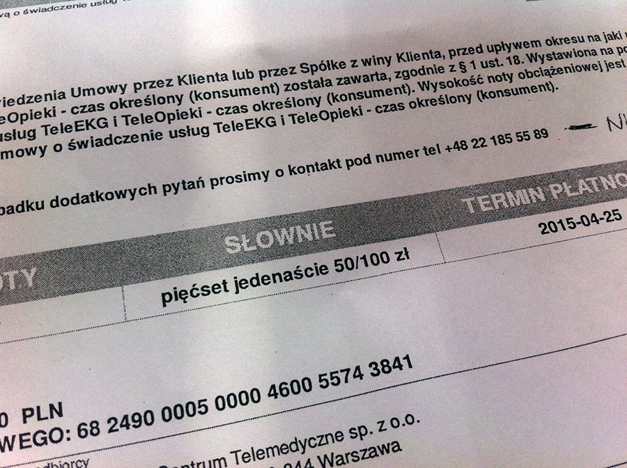 - Na początku marca znalazłam w skrzynce list od firmy zajmującej się świadczeniem usług telemedycznych. W środku była jedynie faktura na 60 zł za usługę jakiegoś „Tele-EKG”. Nie miałam pojęcia, co to za firma, ani tym bardziej na czym miałaby polegać ta usługa – mówi nasza Czytelniczka pani Zofia (imię zmienione). – Co ciekawe, dosłownie dwa dni później w skrzynce był kolejny list z rachunkiem, tym razem na kwotę 9 zł za aktywację wspomnianej usługi. Samo to, że najpierw wystawiają opłatę za korzystanie z usługi, a później dopiero wystawiają rachunek za jej aktywację, jest mocno podejrzane. Tym bardziej, że ja przecież w życiu z tą firmą nic nie podpisywałam.