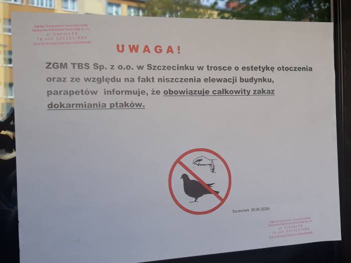Zauważyłam, że w niektórych miejscach na osiedlu Koszalińska pojawiły się informacje, pod którymi podpisał się szczecinecki ZGM. Na kartce można przeczytać komunikat, żeby nie dokarmiać gołębi "ze względu na estetykę otoczenia". Czy rzeczywiście jest to aż tak ważny problem?