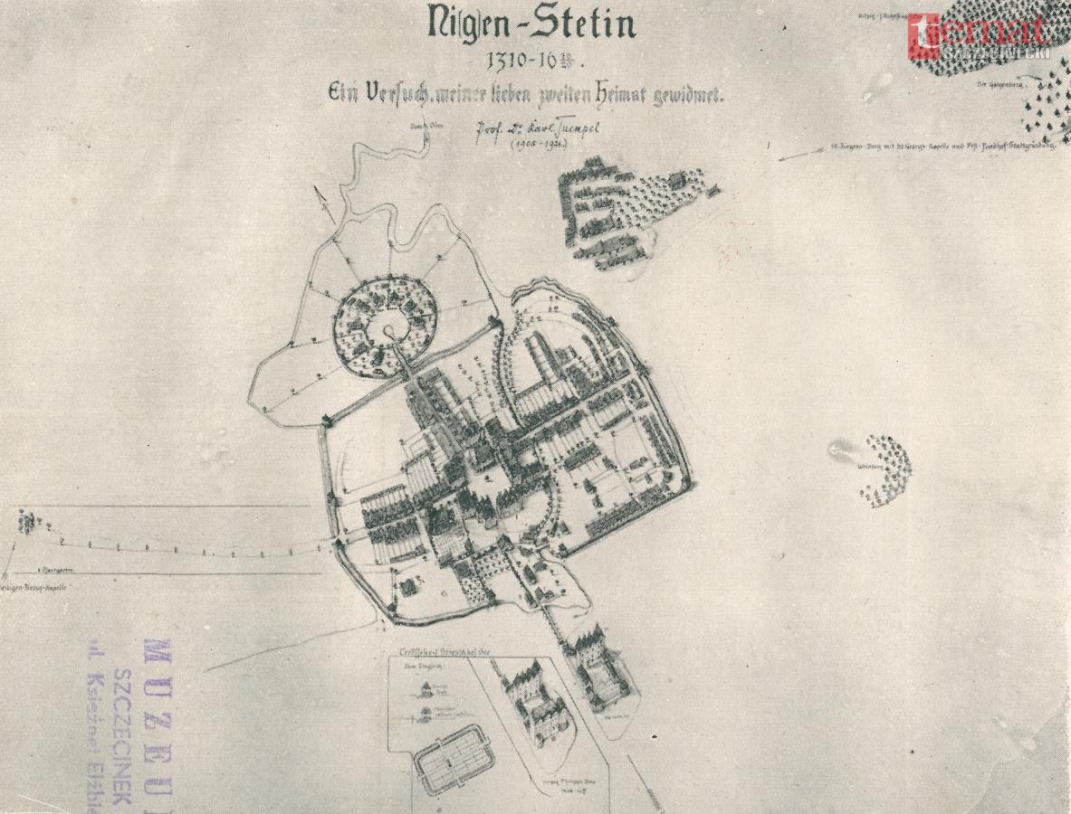 Sporządził go w 1905 roku prof. Karl Tümpel, nauczyciel historii Gimnazjum Księżnej Jadwigi. Profesor kreśląc swój plan, posiłkował się archiwaliami, które z powodu tragicznej wojennej pożogi przepadły już na zawsze. Dzisiaj możemy co najwyżej zweryfikować profesorskie dzieło z pracą kartografa Eilhardusa Lubinusa. To ten sam, który w 1618 roku na swojej Wielkiej Mapie Księstwa Pomorskiego zamieścił m.in. panoramę naszego miasta.