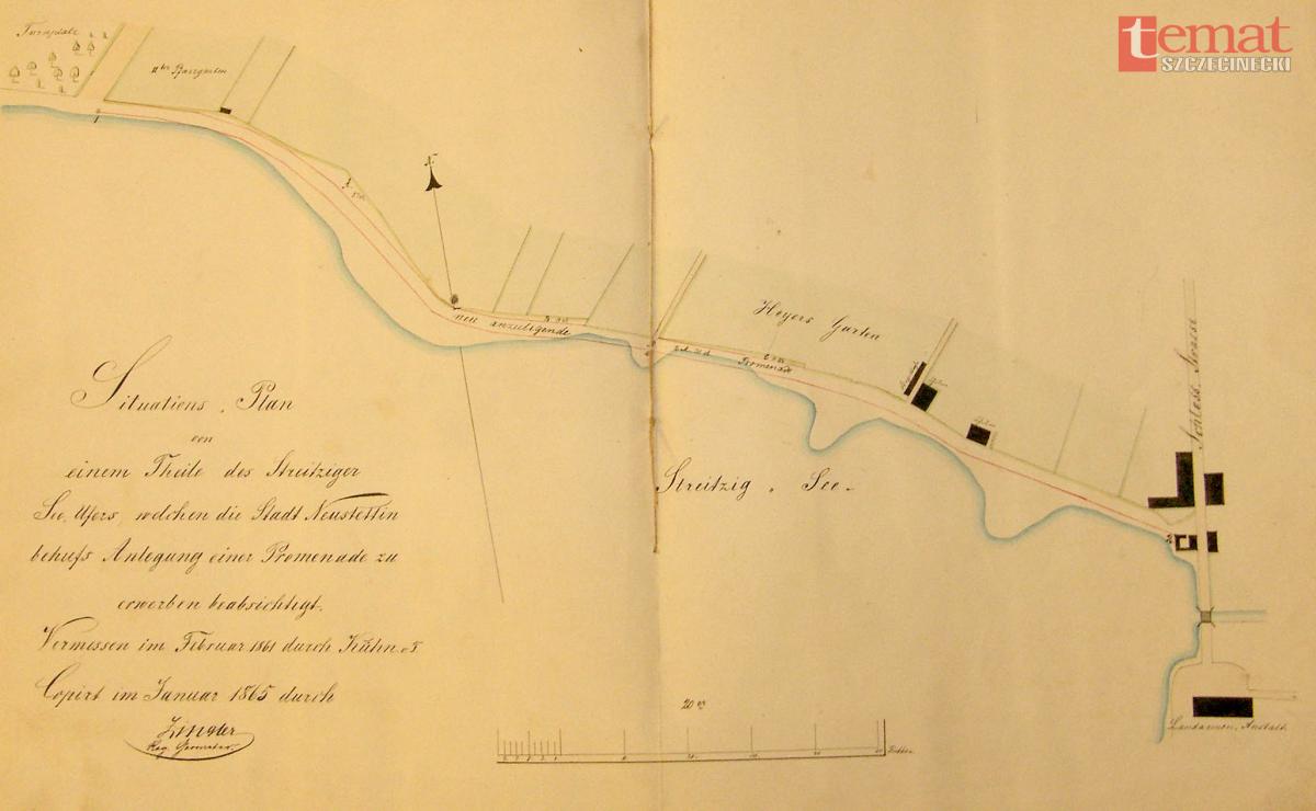 Z równego, kaligraficznie sporządzonego pisma z datą 1865 r. i nieczytelnym podpisem osoby sporządzającej projekt wynika, że jest to część brzegu jeziora Trzesiecko z przebiegiem projektowanej w tym miejscu promenady. Poprowadzona ona została dokładnie trasą dzisiejszej jezdni ul. Ordona. W tamtym czasie (przypomnijmy, że w 1892 roku po raz ostatni obniżono poziom wód Trzesiecka), jeziorny brzeg przebiegał na linii krawężnika dzisiejszej jezdni. Przedłużeniem ul. Zamkowej była dróżka z mostkiem w połowie jej długości, pod którym znajdował się jeden z dwóch wypływów ówczesnej Niezdobnej.