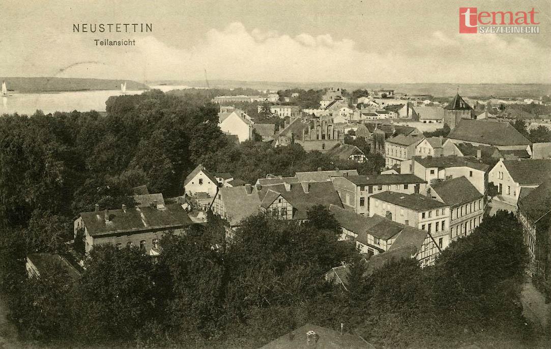 Newen Stettin pokazany został ze szczytu, bądź tylko z podnóża Góry (Winnicznej) Rynkowej. Tamże, jak na dłoni, widać północne skrzydło zamkowe jeszcze w wystroju gotyckim, lecz zamiast mostu są już dwie ziemne groble – jedna od strony dz. ul. Limanowskiego, a druga od Zamkowej.