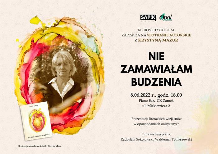 Tym razem będzie to spotkanie autorskie z Krystyną Mazur, wieloletnią szefową szczecineckiego OPAL-u. Wyjątkowo podczas wydarzenia zaprezentowane zostaną nie utwory poetyckie, ale - opowiadania oniryczne. Utwory pochodzą z najnowszego tomu autorki, zatytułowanego "Nie zamawiałam budzenia".