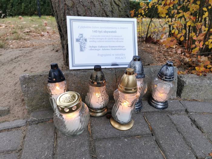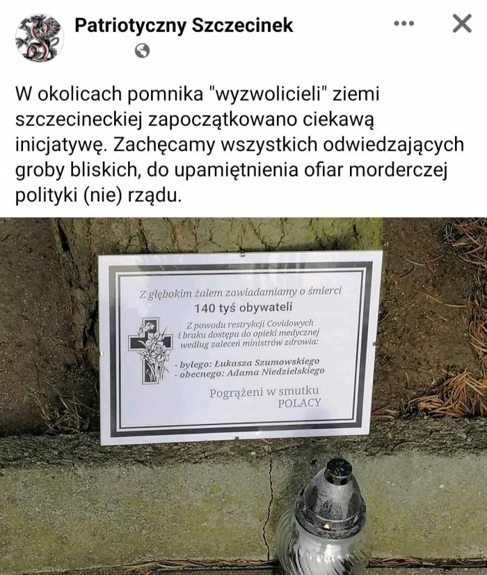 Z głębokim żalem zawiadamiamy o śmierci 140 tys. obywateli z powodu restrykcji covidowych i braku dostępu do opieki medycznej według zaleceń ministrów zdrowia (...). Pogrążeni w smutku Polacy.