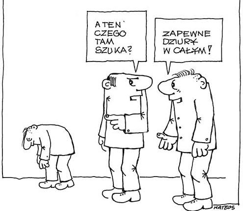 Nie dalej jak dwa tygodnie temu idąc chodnikiem, który czasy minione pamięta (a to będzie lat trzydzieści z małym hakiem) potknąłem się o dziurę i... orła wywinąłem boleściwie tłukąc sobie kolanka oba, o lewym łokciu już nie wspominając. A że szacunek do zabytków mam tom nijakich wulgaryzmów nie ciskał, ino od tej chwili spacerując przestałem gapić się w chmury i pod nogi patrzę, aby znowu się nie wykopyrtnąć. Na rezultaty obranej taktyki długo czekać nie musiałem, gdyż jakieś dwa dni później idąc zauważyłem, że u stóp mych leży mały, okrągły i złocisty 1 grosz. Zgodnie ze zwyczajem, podniosłem go, chuchnąłem i do kieszeni schowałem – wszak jak powiadają grosz do grosza i możesz po jakimś czasie kupić sobie kalosza. Niby nic, a jednak prawny środek płatniczy. To dzięki niemu robiąc zakupy możesz się poczuć jak panisko, nie czekając aż w kasie ci tej wysokości resztę wydadzą. Biada jednako, jeśli to ty jesteś winien jakoweś instytucji tę niepozorną żółtawą monetę! Oj, nie odpuszczą! Będziesz ścigany z całą bezwzględnością.