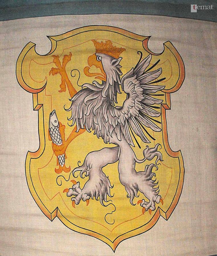 Nieco zbliżony do płaskorzeźby kształt ma gryf i ryba na miejskim sztandarze z końca XIX wieku. Dodam, że sztandar znajduje się w zbiorach Muzeum Regionalnego. Po raz pierwszy dowiadujemy się tym razem także o kolorystyce. Tarcza ma żółte tło, stylizowany gryf ujęto w odcieniach szarości ze złocistymi szponami, a ryba – najwyraźniej nie jest to jesiotr, jest w kolorze białym. Co ciekawe, łeb kroczącego gryfa przyozdobiono koroną. Tymczasem Szczecinek nie był miastem królewskim, a więc tego rodzaju atrybut jawi się pewnego rodzaju nadużyciem.