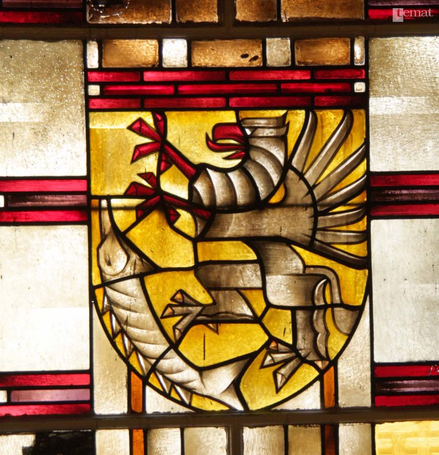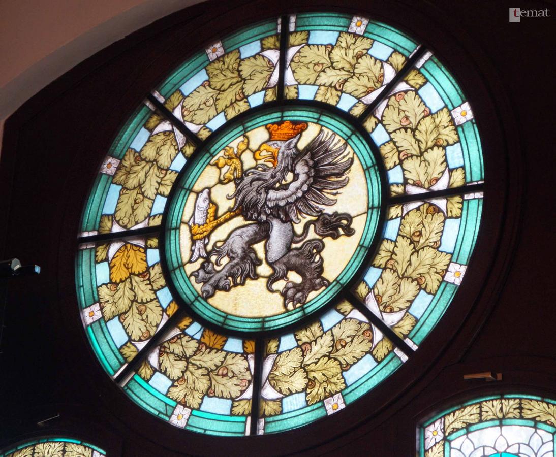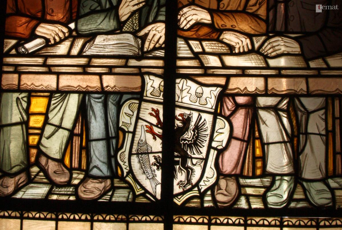 Ta wersja tarczy herbowej została powtórzona na witrażu auli Szkoły Muzycznej – przedwojennej siedziby landrata (starosty). Dodam, że gmach wzniesiono w 1902 roku i twórca umieszczonych tam witraży z pewnością wzorował się właśnie na herbie z miejskiego sztandaru.