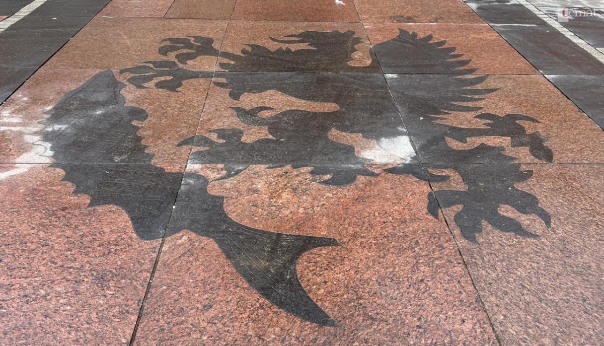 Po ostatniej przebudowie placu Wolności (2017) na czerwonych kamiennych płytach wpasowano czarną rybę i gryfa, których kształt nawiązuje do obecnej, a więc zniekształconej wersji.