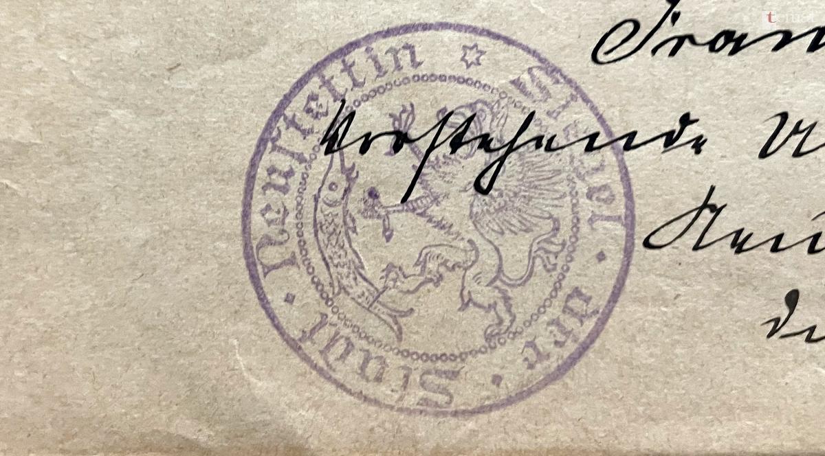 W tym artykule załączam jedynie wybrane przykłady obrazujące jak kształtował się herb miasta od końca XIX wieku. Oto odcisk pieczęci z odręcznie napisanym pismem urzędowym z 22 maja 1914 roku. Pod tekstem widnieje taki oto odcisk z herbem miasta.