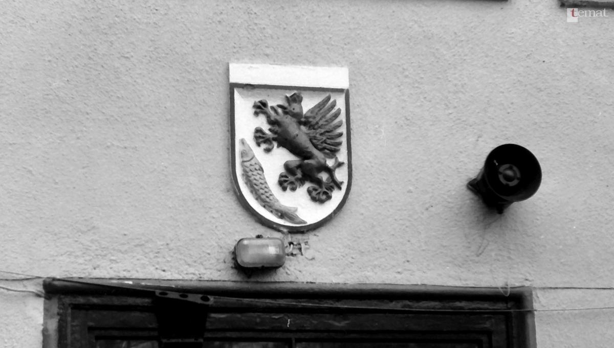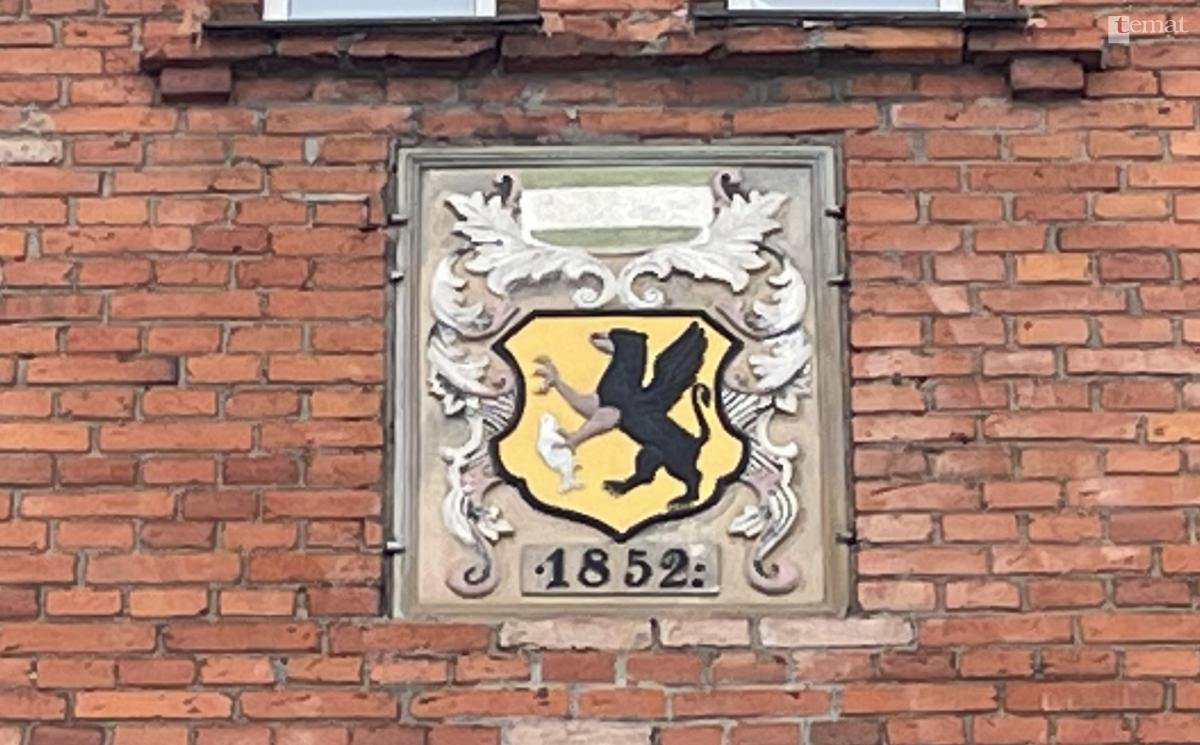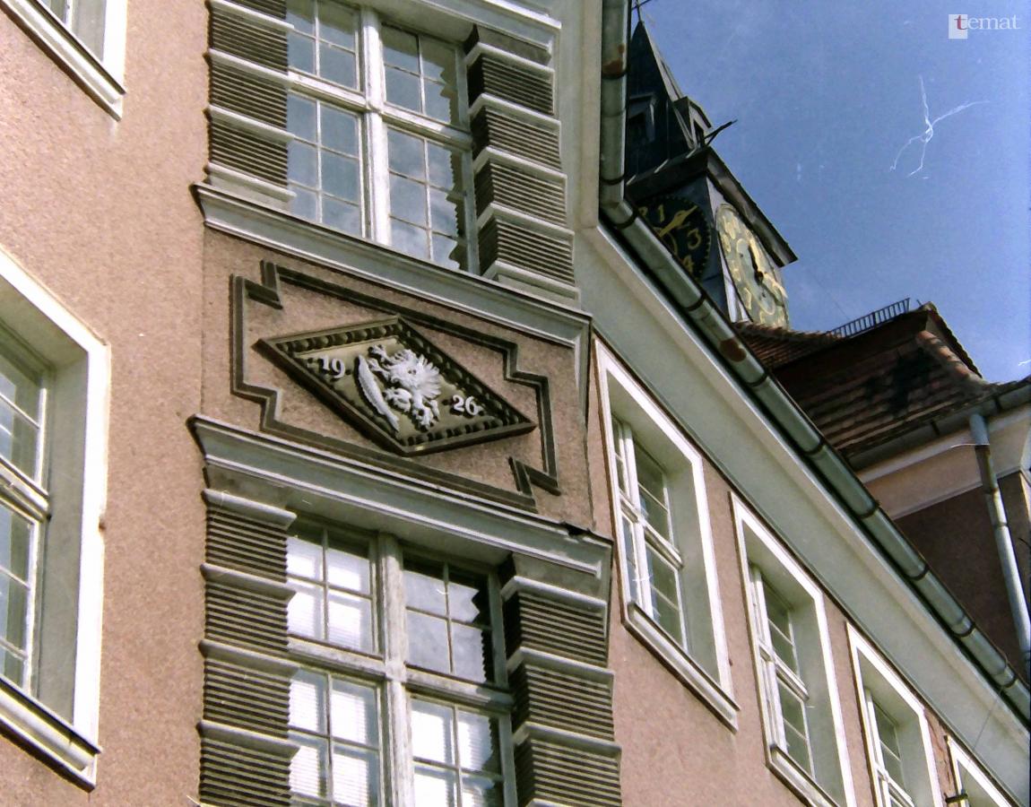 Najwyraźniej w tym czasie (1852) wygląd gryfu oraz ryby ewaluował, czego przykładem jest kartusz z herbem umieszczony z datą budowy nad wejściem do ratusza. W ostatnich kilkunastu latach gryf był pomalowany na czerwono. Tym razem nie wiadomo z jakich powodów, po ostatniej renowacji ratuszowych ścian kartusz „przyozdobiono” zupełnie odmienną kolorystyką. Możemy się zastanawiać, czy naprawdę warto było płaskorzeźbę kolorować? Czy nie lepiej utrzymać ją w naturalnej dla niej kolorystyce kamienia, z którego została wykonana?