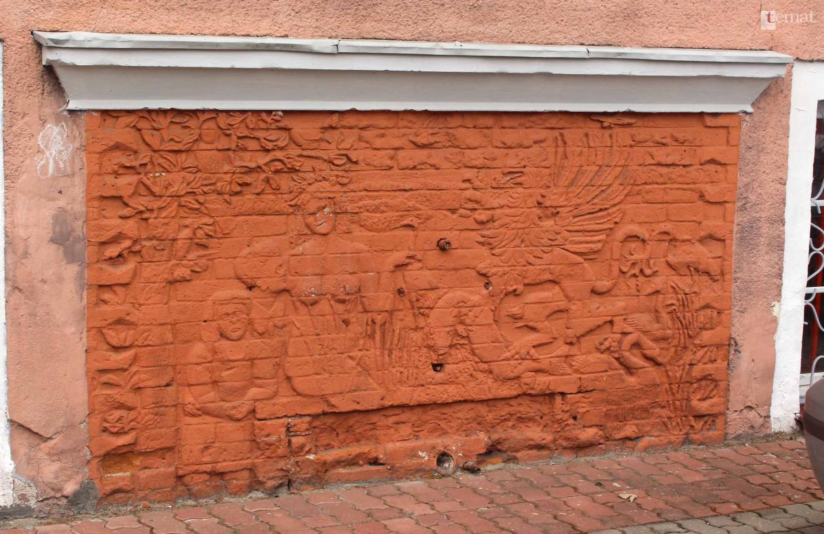 Na uwagę zasługuje dość niezwykła, bo ceglana(!) płaskorzeźba stanowiąca niegdyś oprawę przyściennej fontanny. Znajduje się na poziomie przyziemia od strony boiska w SP-1. Zarówno gryf trzymający w szponach najwyraźniej martwego już jesiotra, stanowią jedynie fragment scenki z nieznanej współczesnym mieszkańcom legendy. Zdjęcie wykonałem w 2019 roku. Dzisiaj w tym miejscu ustawiono… stojaki na rowery.