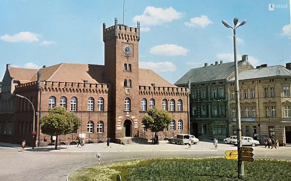 Nie mniej pomocne była również wersja herbu upowszechniona w latach 60. Właśnie w takiej wersji a więc ze złotym (żółtym) polem, czarnym gryfem, białym jesiotrem wisiał herb na ratuszowej więzy. „Wisiał” ponieważ wymalowano go na sklejce bądź płycie wiórowej przesłaniając przy tym oryginalny kartusz herbowy. Pojawiał się tam w okresieobchodów związanych z 650-rocznicy założenia miasta. Ten stan rzeczy uwieczniono na widokówce z 1969 roku.