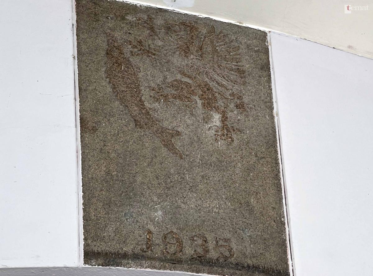na płaskorzeźbie w ścianie wykusza SP-1, wydanego w 1938 roku planu miasta, pism urzędowych i odcisku pieczęci urzędu miasta z tego okresu.