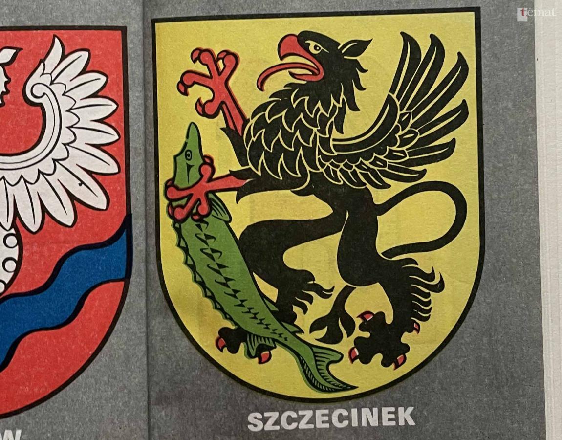 W 1989 roku ukazała się ilustrowana książeczka autorstwa Mariana Czernera z herbami ówczesnego województwa koszalińskiego. Autor w przypadku Szczecinka wprawdzie przyznaje, że historycznym herbem miasta jest kaszubski czarny gryf na złotym polu, ale na załączniku graficznym zamieszcza stylizowanego czarnego gryfa dzierżącego w szponach… zielonego jesiotra. Jego propozycja ograniczyła się jedynie do książki, bo nigdzie indziej tej wersji nie widziałem.
