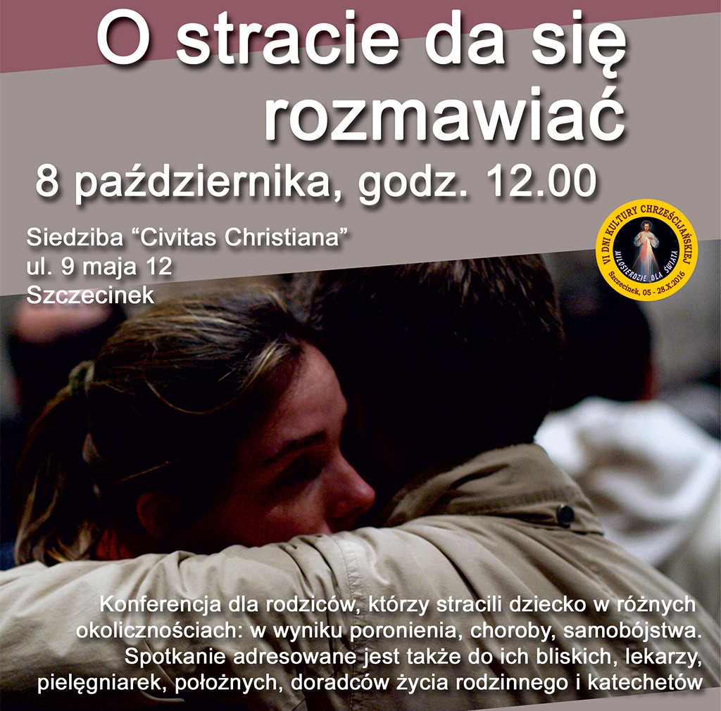 Już 8 października w siedzibie Katolickiego Stowarzyszenia "Civitas Christiana" w Szczecinku odbędzie się konferencja „O stracie da się rozmawiać”. Adresowana jest głównie do rodziców, którzy stracili dziecko w różnych okolicznościach: jeszcze przed narodzeniem w wyniku poronienia, z powodu choroby czy samobójstwa. Konferencja adresowana jest także do bliskich tych rodziców, do lekarzy, pielęgniarek i położnych, do doradców życia rodzinnego i katechetów.