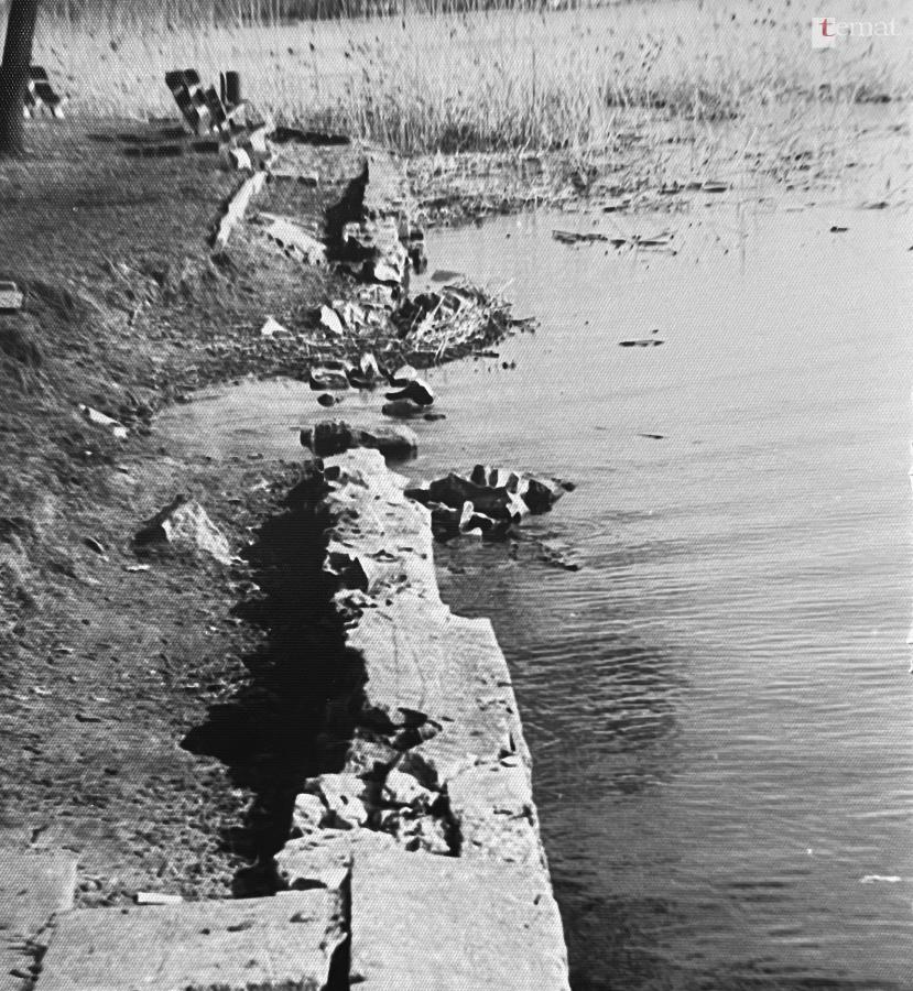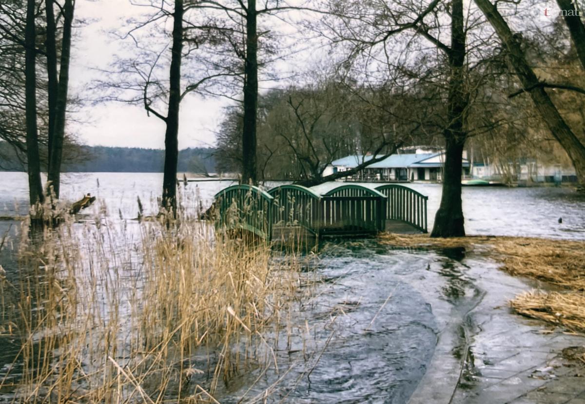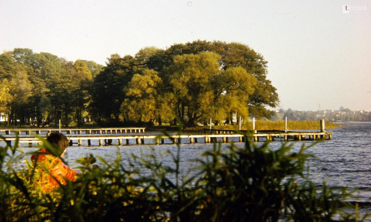 Pierwsze zmiany w sposobie zagospodarowania wysepki nastąpiły w latach 90. To wtedy wykonano, a właściwie odbudowano od podstaw, od strony parku betonowe umocnienie brzegów. Zmiany nastąpiły dopiero przy odbudowie w latach 90 betonowego nabrzeża. A jak prezentował się w tym czasie jeziorny brzeg, widać na zdjęciu wykonanym przez Ryszarda Bańkę.