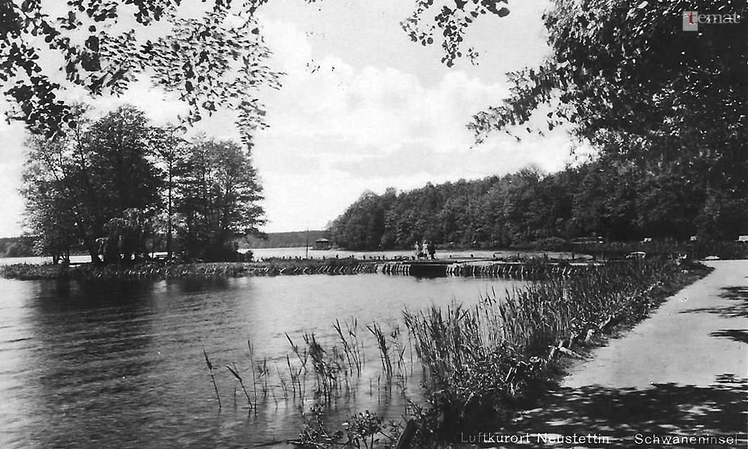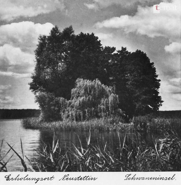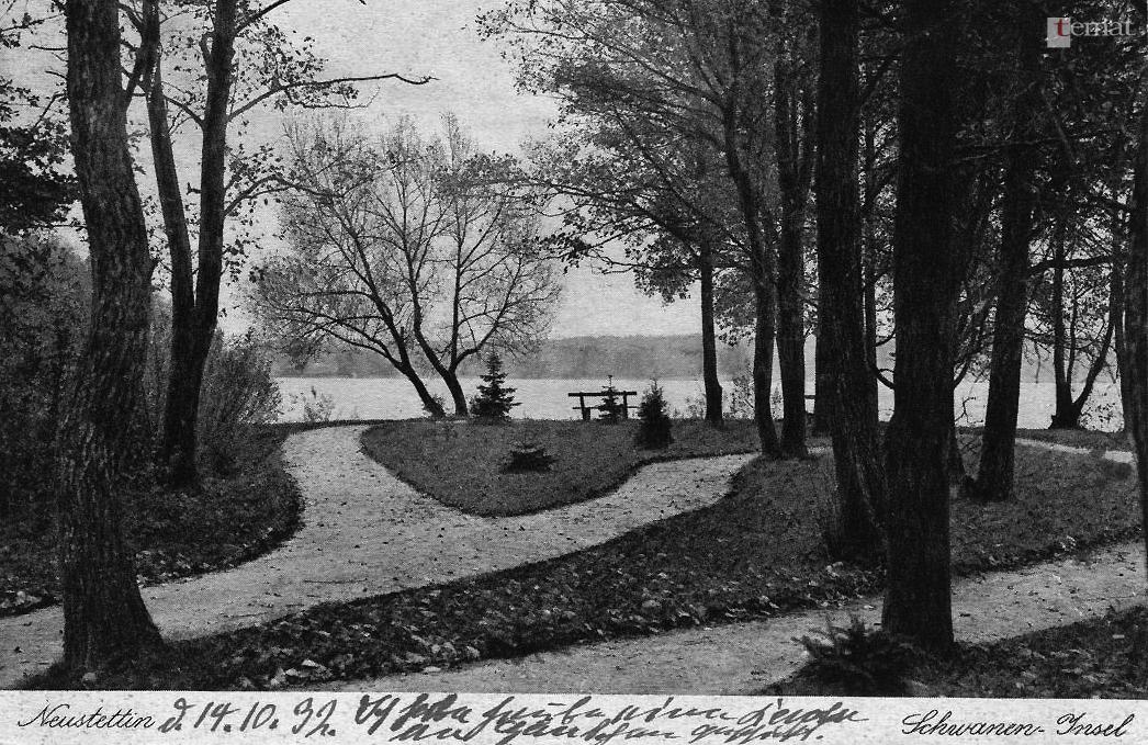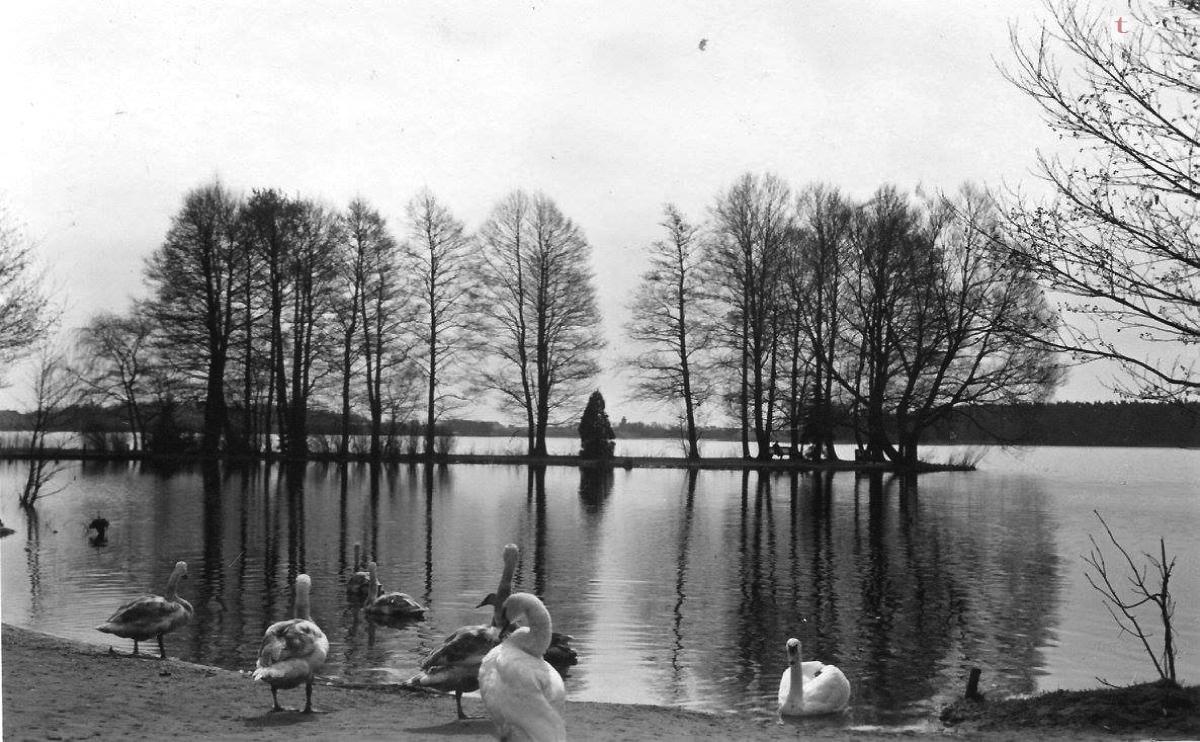 Kolejna pocztówka przedstawia widok na wysepkę od strony zachodniej. Już wtedy miejsce to cieszyło się sporym powodzeniempośród łabędzi. Przypomnę, że pierwsze łabędzie w Szczecinku pojawiły się dopiero w 1905 roku. Przywieziono je z dalekiego Hamburga. Był to ponoć dar od tamtejszych mieszkańców. Obecnie ptasia populacja jest jakby nieco mniej liczna, niż bywało to jeszcze kilka lat temu.