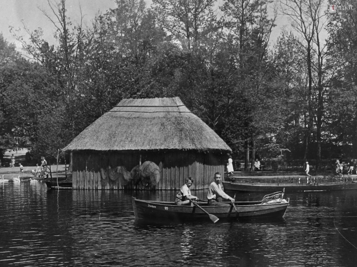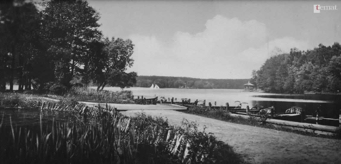 A to podobne ujęcie z lat trzydziestych. Na pierwszym planie mostek z cumującymi przy nim łodziami dla turystów i bardzo zniszczonym umocnieniem brzegu z drewnianych palików z faszyną, a nawodnej chaty już nie ma.