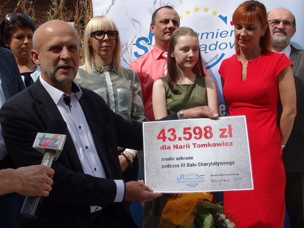 W piątek (13.05) w Sint Jin Lounge Bar & Rooms starosta szczecinecki Krzysztof Lis w obecności członków Porozumienia Samorządowego uroczyście przekazał Narii Tomkowicz i rodzicom dziewczynki czek opiewający na rekordową sumę 43 598 zł. To wspaniałe ukoronowanie wysiłku wszystkich ludzi, którzy włożyli ogrom pracy w organizację balu, zwieńczonego tak ogromnym sukcesem.