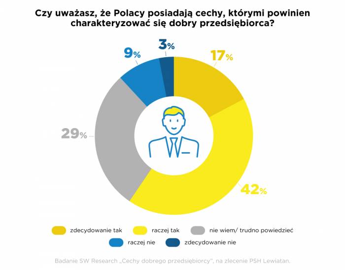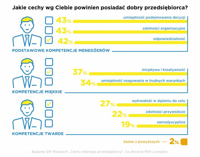 Marka polskiego przedsiębiorcy jest silna. Jak wynika z badania „Cechy dobrego przedsiębiorcy”, przeprowadzonego na zlecenie PSH Lewiatan, Polacy zdecydowanie przedsiębiorczość mają we krwi. Zapytani o to, jakie cechy powinien posiadać dobry przedsiębiorca odpowiedzieli, że są to decyzyjność (43%), umiejętność zarządzania (43%) i odpowiedzialność (42%). Zaraz za nimi istotną rolę grają inicjatywa i kreatywność (37%) oraz umiejętność reagowania w trudnych sytuacjach (34%). Na końcu rankingu cech dobrego przedsiębiorcy uplasowały się wytrwałość w dążeniu do celu (27%), zdolności przywódcze (22%) i samodyscyplina (19%). Jednak nawet ci, którzy mogą poszczycić się posiadaniem wszystkich wymienionych cech, w ostatnich czasach nie mają lekko.