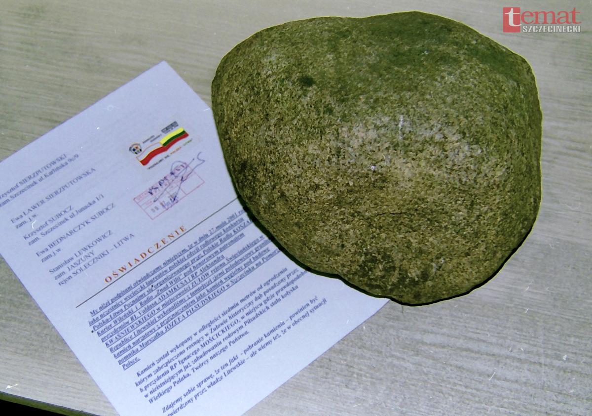 My niżej podpisani oświadczamy niniejszym, że w dniu 27 maja 2001 roku jako uczestnicy wycieczki laureatów polskiej edycji radiowego konkursu (…) w miejscowości Zułów rejonu Święcińskiego w Republice Litewskiej wykopaliśmy z tamtejszej ziemi polodowcowy granit (…) z przeznaczeniem jako kamień węgielny pod budowę pomnika marszałka Józefa Piłsudskiego w Szczecinku na Pomorzu w Polsce (…) Kamień wykopano w odległości 7 m od ogrodzenia, w którym zabezpieczono rosnący w Zułowie historyczny dąb posadzony przez b. prezydenta Ignacego Mościckiego (…) (