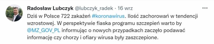 Do wzrostu zakażeń i prowadzonej akcji szczepień odniósł się na Twitterze poseł KP Radosław Lubczyk (z zawodu lekarz stomatolog). Realizację narodowego programu szczepień poseł określił jako “fiasko”. Co więcej, poseł podzielił się opinią, że resort zdrowia, podając nowe informacje o zakażeniach koronawirusem, powinien także ujawniać, czy ofiary wirusa i chorzy byli zaszczepieni.
