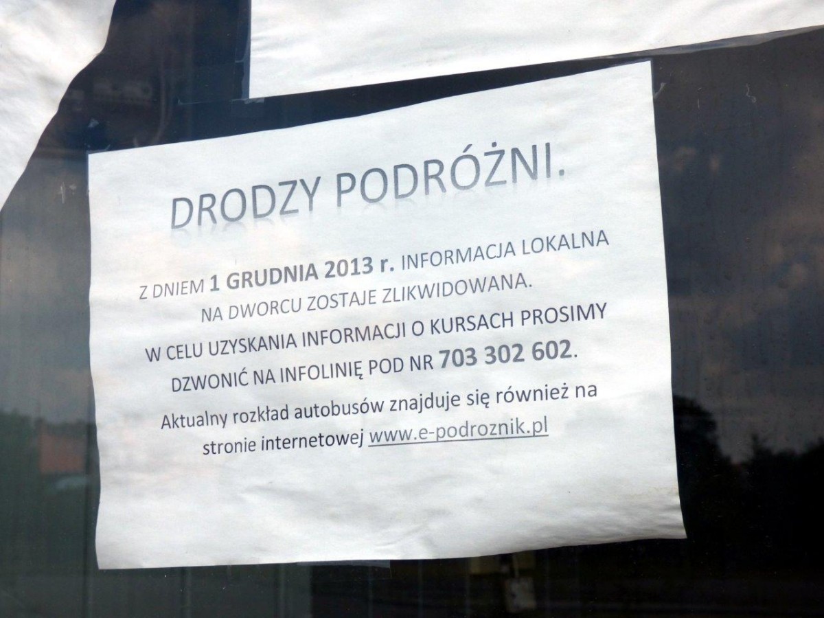 foto: archiwum Tematu: informacja na nieistniejącym już budynku dworca PKS o likwidacji punktu informacyjnego dla podróżnych. To był dopiero początek końca dworca przy ul. Kaszubskiej / Szafera.
