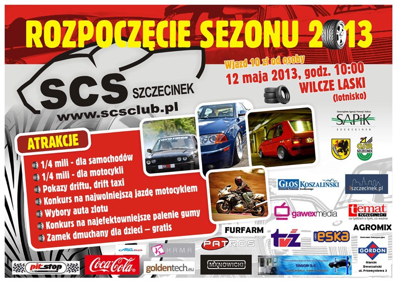 Ta wiadomość z pewnością ucieszy wszystkich amatorów i miłośników czterech kółek. Stowarzyszenie Promocji Sportów Motorowych SCS Szczecinek oraz Samorządowa Agencja Promocji i Kultury zapraszają wszystkich mieszkańców na Motoryzacyjne Otwarcie Sezonu 2013. Impreza wzorem lat ubiegłych odbędzie się na lotnisku w Wilczych Laskach. 12 maja już od godz. 10.00 fani unikalnych pojazdów i szybkiej jazdy z pewnością będą mogli znaleźć tu coś dla siebie. Tradycyjnie podczas spotkania nie zabraknie pokazów driftingowych i drift taxi oraz wyścigów na 1/4 mili (zarówno dla samochodów, jak i dla motocykli) z wykorzystaniem profesjonalnego sprzętu pomiarowego. Impreza oczywiście nie mogłaby się obyć bez licznych konkursów. Kierowcy zmierzą się ze sobą m.in. w zawodach na najefektywniejsze palenie gumy, a zwolennicy dwóch kółek wezmą udział w konkursie na najwolniejsza jazdę motocyklem. Na płycie lotniska nie zabraknie oczywiście również unikalnych, a niekiedy wręcz zabytkowych samochodów, a spośród wszystkich pojazdów biorących udział w imprezie organizatorzy wybiorą auto zlotu. Ponadto dla najmłodszych uczestników jak zawsze będzie dmuchany zamek, gdzie dzieciaki będą mogły się wyszaleć za darmo. Wstęp na imprezę - 10 zł od osoby.(mg)