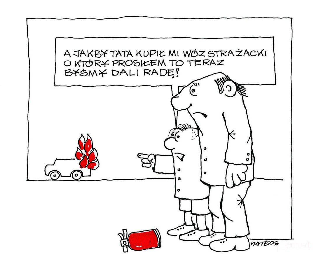 Jechałem sobie szosą krętą fiatem 126p, gdy nagle ujrzałem przed sobą milicyjną nyskę, z której dym się wydobywał i płomień niewielki, a przy owym aucie miotało się bezradnie dwóch funkcjonariuszy służb wiadomych. Jak na obywatela przystało zatrzymałem się, chwyciłem gaśnicę i ruszyłem z pomocą. Mój ów sprzęt ppoż. zadziałał prawidłowo i... pojazd ocalał. Niestety nie dzięki owej gaśnicy (choć sikała ostro), ino dzięki służbowej kurtce milicjanta, którą to jej ów funkcjonariusz skutecznie płomień zdusił.