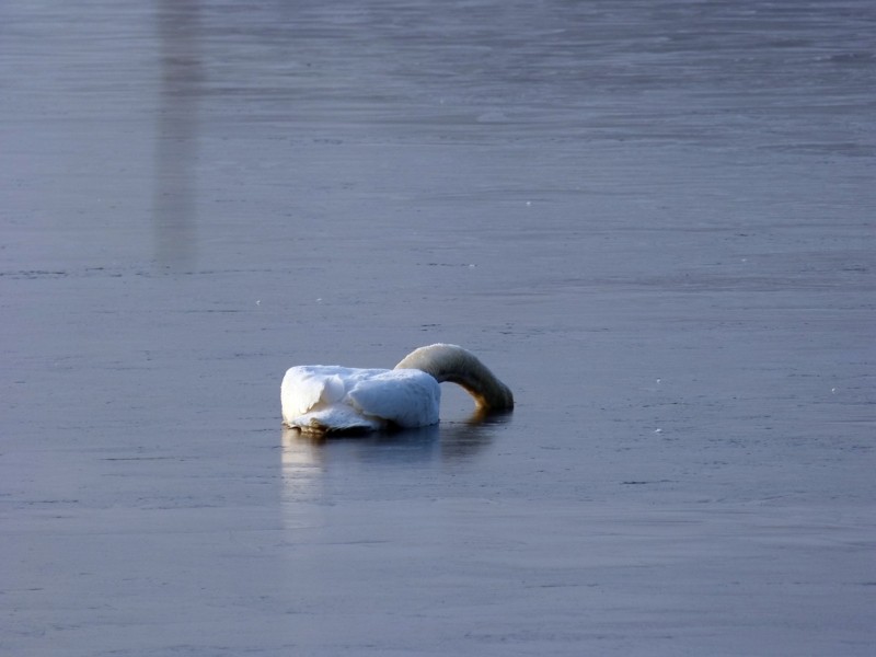 Sprawę polecamy naszym strażnikom miejskim i Powiatowemu Lekarzowi Weterynarii. Wcale niewykluczone, że padły łabędź był chory (ptasia grypa?) i po prostu nie miał siły wydostać się z lodowej pułapki. (sw)