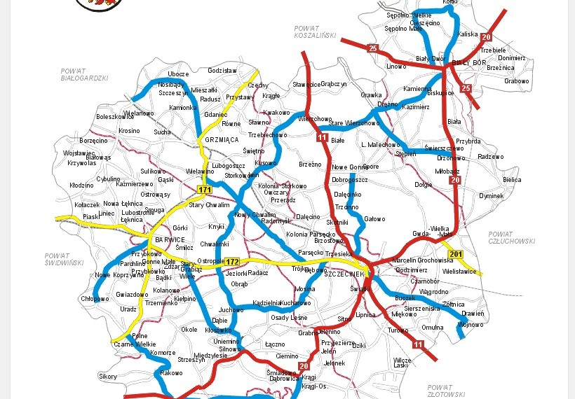 Informacja o stanie wybranych odcinków dróg powiatowych dostępna jest pod adresem: http://www.powiat.szczecinek.pl/drogi/index.php. Żeby dowiedzieć się szczegółów na temat stanu interesującej nas drogi, wystarczy ustawić kursor myszki na wybranym odcinku jezdni (drogi powiatowe oznaczone są kolorem niebieskim). Wówczas zostanie wyświetlona poszukiwana przez nas informacja. Z kolei kliknięcie na obszarze drogi wojewódzkiej lub krajowej spowoduje przejście do odpowiedniego serwisu ZZDW lub GDDKiA.