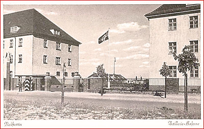 Dzisiejsza ul. Słowiańska z przyległościami powstała za przyczyną budowy w tej części Szczecinka kompleksu koszarowego. W tamtych czasach mówiło się, że koszary budują przy „żółtnickiej szosie”. Tak właściwie, to ten rejon miasta został zaprojektowany przez wojskowe biuro projektów w Berlinie. Jak wynika z zachowanego do dzisiaj planu zagospodarowania, datowanego na 6 marca 1939 roku, w tym czasie, oprócz istniejącego już kompleksu koszarowego przy Deutsche Strasse (to dz. ul. Słowiańska), istniały już dwa trzyklatkowe bloki mieszkalne. Trzeci z nich (ten od ul. Szymanowskiego) znajdował się w trakcie realizacji. Plany przewidywały taką samą zabudowę również po drugiej stronie ulicy. Od dz. ul. Matusewicz do skrzyżowania z ul. Armii Krajowej planowano wybudowanie w sumie 4 domów z 66. mieszkaniami, nie licząc kilku innych, ale już tylko jednoklatkowych. Ich budowę przerwała wojna. Po wojnie, w miejscu planowanych budynków, Rosjanie urządzili ćwiczebny tor przeszkód. Kompleks koszarowy powstał już w październiku 1935 roku. Najprawdopodobniej zdjęcie bramy wjazdowej znajdującej się dokładnie w osi nowopowstałej w tym czasie Artillerie Strasse (dz. ul. Artyleryjska), zostało wykonane rok – dwa po wprowadzeniu się tutaj batalionu artylerii. Świadczą o tym choćby dopiero co posadzone małe teraz potężne, zmasakrowane „sanitarnymi cięciami” lipy. Dzisiejszy wjazd na teren byłych koszar niewiele przypomina ten, który był w tym miejscu jeszcze w 1992 roku, kiedy Szczecinek opuszczała Sowiecka Armia. Jeszcze do lat siedemdziesiątych jezdnia ul. Słowiańskiej na swojej całej długości, a więc od skrzyżowania z ul. Armii Krajowej do ul. Cieślaka (ta ostatnia była jedynie polną drogą), wyłożona była asfaltową kostką. Dzisiaj tego rodzaju nawierzchni już się nie spotyka, bo taka kostka nie była dostosowana do ciężkiego i dużego natężenia ruchu. Oprócz ul. Słowiańskiej taką samą kostką wyłożona była jezdnia ul. Mickiewicza i Piłsudskiego. Dodajmy, że ulicą aż do lat 70. jeździły praktycznie jedynie wojskowe ciężarówki, a także wracające z ćwiczeń kolumny artyleryjskich ciągników na gąsienicach ciągnące przeciwlotnicze działa. Jezdnia bardzo szybko została zniszczona z chwilą włączenia jej do obwodnicy. Po lewej stronie bramy w szczycie budynku koszarowego, znajdowało się biuro przepustek oraz areszt. Przed bramą na wysokiej, ceglanej kolumnie, umieszczona była rzeźba gapy trzymającej w szponach wieniec ze swastyką. Kolumna ta, tyle że już ze strzaskaną gapą, istniała przez kilkanaście powojennych lat. Z czasem Rosjanie przy prawej furcie bramy dobudowali parterową budkę. W latach 90. po przebudowaniu budynków koszarowych na mieszkania, bramę wraz z częścią płotu rozebrano. Dzisiaj resztki muru po dawnej bramie służą jako wieszak dla pstrokatych plansz reklamowych. (jg)
