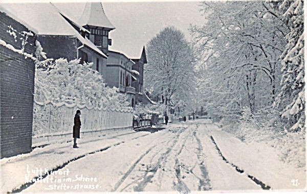 Uliczka z topniejącym w oczach śniegiem wygląda niezwykle uroczo. Białe domy, płoty, bajkowo wyglądające parkowe drzewa. Wszystko to tworzy niepowtarzalny, godny uzdrowiska nastrój. Nie jest więc przypadkiem, że ówczesny Szczecinek powszechnie nazywano kurortem (luftkurort). To właśnie tutaj przyjeżdżano z nie tak znowu dalekiego Berlina na podreperowanie zdrowia. Międzywojenna Stellterstrasse, nazwana tak od nazwiska tutejszego sędziego i zarazem założyciela parku, słynęła z pensjonatów. Wszystkie kamieniczki przetrwały do dzisiaj, tyle że oprócz jednej, już nie mają wspólnego nic ze swoją pierwotną funkcją. Po wojnie patronem ulicy został Julian Ordon - oficer z Powstania Listopadowego, walczący z rosyjskim zaborcą. Nic dziwnego, że wkrótce „niesłusznego” patrona, zastąpiono inną nazwą - Wielkiego Proletariatu, bardziej przystającą do tamtych czasów. Patron powrócił pod koniec lat 80. Najstarsi mieszkańcy pamiętają uliczkę taką, jaką uwieczniono na archiwalnym, pochodzącym najprawdopodobniej z lat 20. zdjęciu. W tamtym czasie jezdnia była tak wąska, że z ledwością mijały się na niej dwa pojazdy. Dlatego też przez bardzo długi czas - już po wojnie - była ulicą jednokierunkową. Latem wysokie drzewa i krzewy zupełnie przesłaniały widok na jezioro, a cała ulica tonęła w cieniu zieleni. Jezdnię poszerzono w latach 60., wycinając bezmyślnie cały pas parkowych drzew i krzewów. Ulica, a właściwie nadjeziorny bulwar, powstał w wyniku obniżenia poziomu wód Trzesiecka. Pierwsze przymiarki w postaci szkicu sytuacyjnego, który zachował się w tutejszym Archiwum Państwowym, zrobiono już w lutym 1861 roku. Szkic przedstawia granice istniejących w tym miejscu ogrodów oraz ówczesną linię brzegową. Tuż za ogrodami, często przed ówczesną linią wody, naniesiono projekt trasy przyszłej, nabrzeżnej promenady. Przypomnijmy, że o promenadzie była mowa w okresie, kiedy brzeg jeziora przebiegał mniej więcej w miejscu dzisiejszej jezdni. Było to jeszcze przed drugą turą robót melioracyjnych, związanych z obniżeniem poziomu jeziora. Prace te zostały przeprowadzone w latach 1866-1868. Ostatni raz poziom wody obniżono dopiero w 1892 roku, a więc cztery lata po wielkiej wiosennej powodzi, podczas której na Rynku (pl. Wolności) woda sięgała 130 cm. W każdym razie początki istnienia nadjeziornego bulwaru sięgają końca XIX wieku. Zdjęcie przedstawia ulicę widzianą od strony więzienia. Wprawdzie domy zostały tak, jak dawnej, za to ich najbliższe otoczenie w niczym już nie przypomina tej dawnej, jakże urokliwej uliczki. (jg)