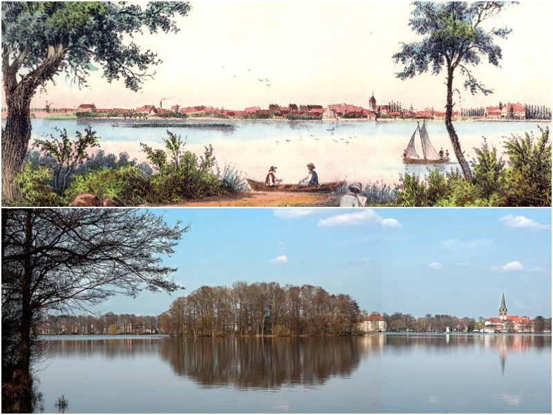 To wtedy po raz trzeci i zarazem ostatni obniżono jezioro. Ponieważ wedutę sporządzono w 1848 roku poziom wód jeziornych w stosunku do dzisiejszego był wyższy aż o ok. 2 m. W tym czasie widoczna na współczesnym zdjęciu Wyspa Sitowia (niem. Binsenberg), znajdowała się jeszcze pod wodą. Na rysunku widać wyłaniającą się w tym miejscu z wody trzcinę i sitowie – stąd wywodzi się nazwa wyspy. Współczesne (polskie) nazewnictwo po raz pierwszy zostało wprowadzone w obieg publiczny z chwilą pojawienia się na rynku (w 1993 roku), pierwszego od czasów wojny(!) planu Szczecinka. Jestem jego autorem i to właśnie wówczas zamieściłem polskie odpowiedniki (z małymi wyjątkami) niemieckich, a więc historycznych, nazw rzeczek, strumieni, wysepek i półwyspów.