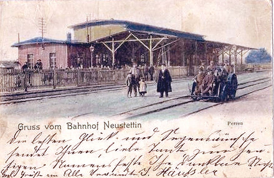 To musiało być niezwykłe wydarzenie. Z tej okazji na dworcu kolejowym zjawiło się mnóstwo gapiów. Wszystko na to wskazuje, że pewnego dnia 1902 roku (z tego bowiem roku pochodzi pocztówka), na szczecinecki dworzec kolejowy przyjechał fotograf, aby na jego tle uwiecznić... jakieś bardzo ważne osoby. Tak więc na pierwszym planie widzimy drezynę na podwoziu ze szprychowych kół parowozu, zaś z przodu siedzisko z trzema - najpewniej jakimiś ważnymi personami. Być może jest to dyrekcja tutejszego węzła kolejowego, ale to tylko przypuszczenia. Tego typu drezyny używane były przez służby utrzymania ruchu do przewozu materiałów i narzędzi, a nawet transportu drużyn roboczych. W tym czasie z reguły miały one napęd ręczny, stąd tak liczna obsługa. Zdjęcie zostało zrobione z trzeciego peronu. W tamtym czasie perony były praktycznie na poziomie torów kolejowych. W tle widać w całej okazałości budynek dworcowy. Pierwsza znana fotografia przedstawiająca dworzec od strony peronów pochodzi z ok. 1890 roku. Na tamtym zdjęciu nie było jeszcze drewnianego zadaszenia. Konstrukcja zatem musiała pojawić się pomiędzy 1890 a 1902 rokiem. Dzisiejszy budynek dworcowy powstał wraz zadaszeniami peronów i przejściem podziemnym dopiero na początku XX wieku, a nie jak się powszechnie sądzi pod koniec XIX wieku. Prócz zdjęcia, drugim takim dokumentem świadczącym o jego rodowodzie, jest pochodząca z 1801 roku mapa Szczecinka. Dodam, że będąca w zbiorach Muzeum Regionalnego mapa została zaktualizowana w 1903 roku. Tamże można zobaczyć jak w pierwszych latach XX wieku wyglądała cała kolejowa infrastruktura. Na mapie zaznaczono m.in. wszystkie obiekty na ówczesnym dworcu, w tym budynek główny. Jego zarysy są takie jak na archiwalnym zdjęciu(!). Wiemy na pewno, że został zbudowany w konstrukcji ryglowej, a część jego ścian była licowana deskami. Podkolorowane zdjęcie najprawdopodobniej niezupełnie odpowiadało rzeczywistej kolorystyce budynku. W parterowym skrzydle po lewej stronie mieściła się ekspedycja bagażowo-towarowa. Z pewnością w dworcowym budynku znajdował się pokój dyżurnego ruchu, kasy biletowe, hol, poczekalnia i być może niewielki bufet, a na piętrze pomieszczenia biurowe i mieszkanie służbowe. Jak wynika z mapy, w tym czasie dworzec miał cztery perony. Co ciekawe, od peronów odgradzał go dość wysoki, drewniany płot. Pierwszy peron (w miejscu dzisiejszego budynku poczty) zakończony był ślepymi torami. Stąd pociągi wyruszały w kierunku Białogardu. Peron drugi obsługiwał pociągi jadące w kierunku Słupska, trzeci w kierunku Chojnic, a czwarty do Piły. Z mapy wynika, że na szczecineckiej stacji w tym czasie była tylko jedna wieża wodna – to ta od strony Kronospanu. Dzisiaj wieża znajduje się w tragicznym stanie i wszystko na to wskazuje, że niebawem z najstarszego zabytku kolejowej architektury zostanie tylko pusty teren. W tamtym czasie nie istniała jeszcze wodna wieża przy wiadukcie. Nie było też samego wiaduktu. W jego miejscu był przejazd z rogatkami. Istniały natomiast już wszystkie budynki mieszkalne znajdujące się przy dzisiejszej ul. Pilskiej, Kolejowej i 28 Lutego. Przy tej ostatniej ulokowany był hotel. Przypomnę, że pierwsze połączenie kolejowe miasto uzyskało dokładnie 15 maja 1878 roku. Była to linia łącząca Czarne z Czaplinkiem.