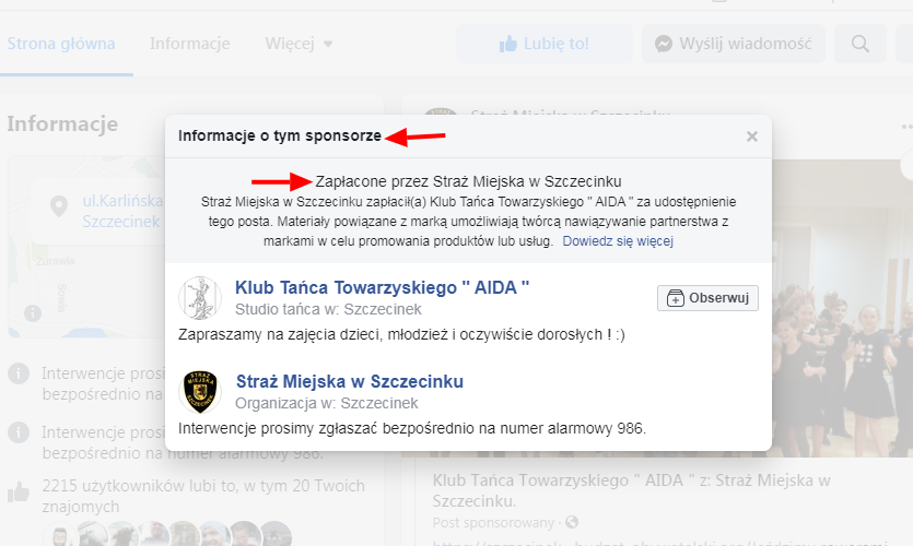 Czerowona strzałka wskazuje , że to Aida ma post sponsorowany a nie Straż Miejska