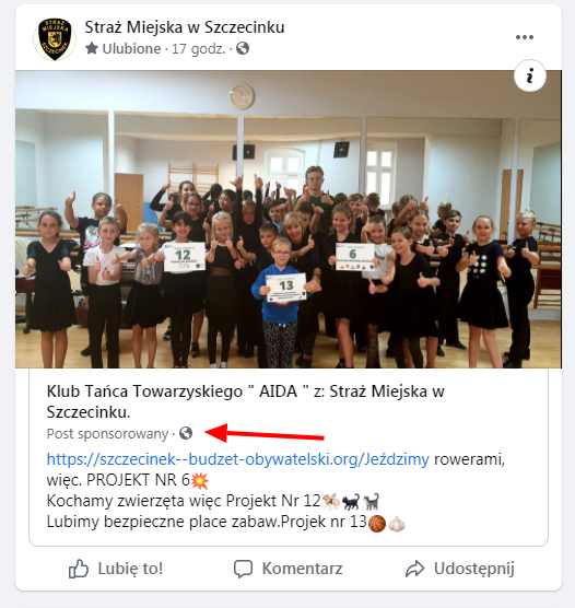 Na tym jednak promocja się nie zakończyła. Obecnie użytkownicy Facebooka mogą oglądać posty płatne, promujące wybrane projekty. Ponieważ FB prowadzi otwartą politykę płatności za posty, łatwo można zobaczyć, że płatnikiem za promocję, która ma pomóc w głosowaniu w Budżecie Obywatelskim, jest w tym przypadku… Straż Miejska w Szczecinku.