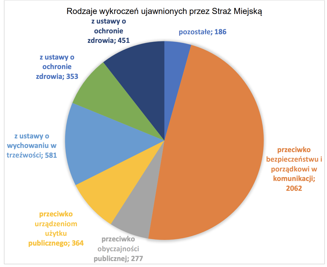 Najczęstsze naruszenia dotyczyły nieprawidłowego parkowania, zakłócania spokoju publicznego, zaśmiecania przestrzeni miejskiej oraz spożywania alkoholu w miejscach publicznych. Na koła źle zaparkowanych pojazdów założono 827 blokad .