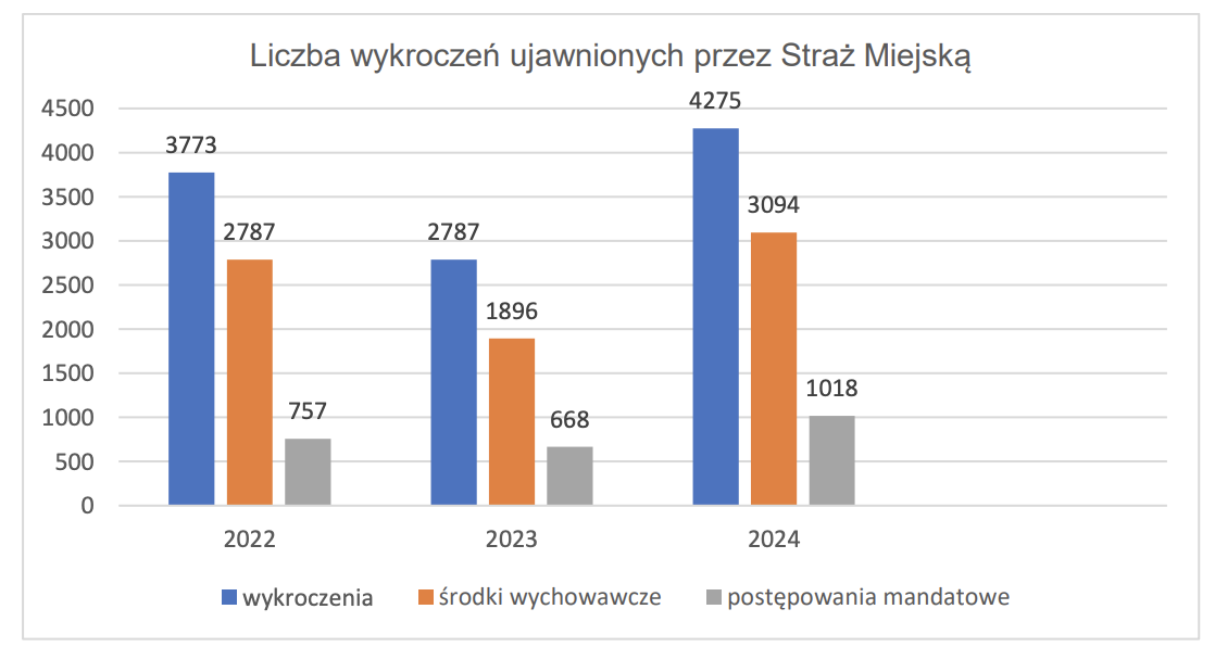 W minionym roku odnotowano aż 6193 interwencje, co stanowi znaczny wzrost w porównaniu z latami ubiegłymi (4765 w 2023 r., 5292 w 2022 r.). Miesięcznie podejmowano średnio 516 interwencji. Wzrosła również liczba wykroczeń – o 35% względem poprzedniego roku, co przełożyło się na większą liczbę pouczeń i mandatów (1018 w porównaniu do 668 rok wcześniej).