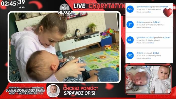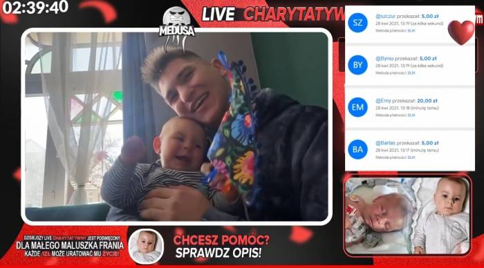 Adrian Salamon, znany w sieci jako "Medusa", we wtorkowy wieczór przeprowadził na swoim kanale YouTube (1,2 mln subskrypcji) wraz z dziewczyną, Olą Mizgalską, charytatywną transmisję na żywo. W jej trakcie, widzowie wpłacali tzw. "donejty". W 40 minut od uruchomienia stream'a, wpłacono dla Frania 2500 złotych! Ale należy pamiętać, że to kwota, która "aktualizowała" się z już wyświetlonych wpłat - widzowie informowali, że ich donate'y trafiały do kolejki i na ich odczytanie przez system trzeba było czekać nawet 40 minut! Po 50 minutach, było już 4 tysiące złotych, a po 10 kolejnych minutach - następny tysiąc!