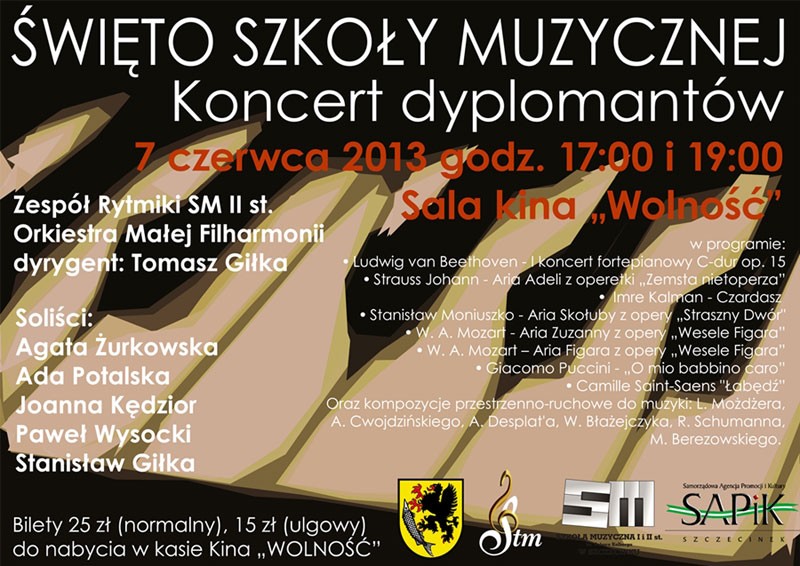 Koncert dyplomantów odbędzie się w kinie Wolność o godzinie 17.00 i 19.00. Bilety 25 zł (normalny), 15 zł (ulgowy) do nabycia w kasie kina. (sz)