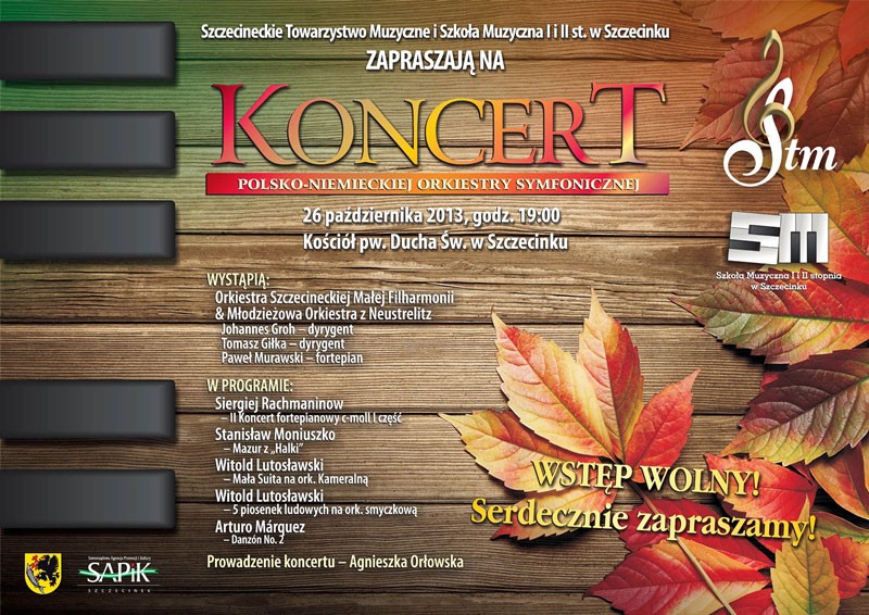 Szczecineckie Towarzystwo Muzyczne i Szkoła Muzyczna I i II st. w Szczecinku zapraszają na koncert polsko-niemieckiej Orkiestry Symfonicznej, który odbędzie się 26 października 2013 o godz. 19:00, w Kościele pw. Ducha Św. w Szczecinku.