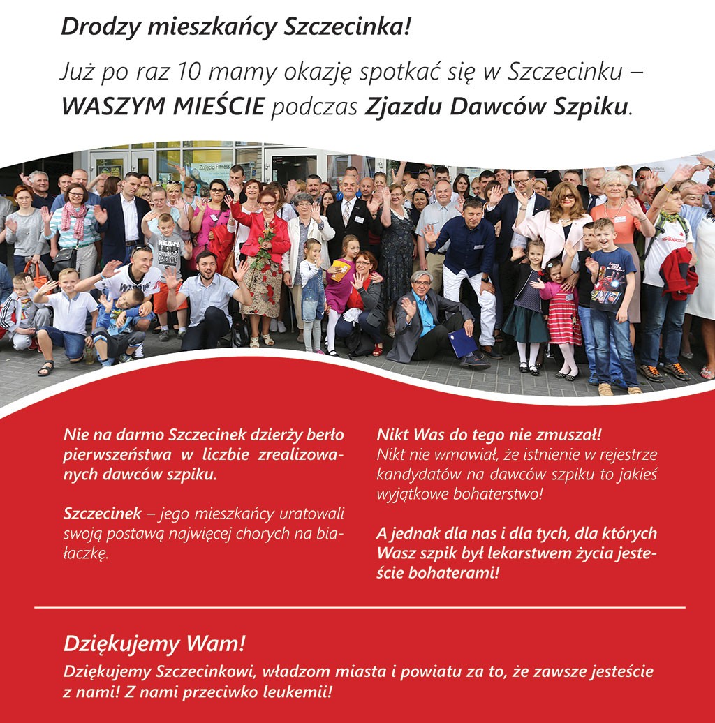 Nikt ich do tego nie zmusza, nie namawia, nikt nie przekonuje, że zapisanie się do rejestru dawców to prawdziwe bohaterstwo. A jednak - są i chcą pomagać. Dawcy życia - bo tak mówi się o osobach, które oddając szpik, pomogły innym w walce z rakiem krwi - znów spotkają się w Szczecinku. Dziesiąty już zjazd rozpocznie przybycie specjalnej sztafety biegaczy, która pod hasłem “Bieg po Szpik - Sztafeta Życia" wyruszy do Szczecinka w czwartek, 23.06 z Międzyrzecza. Organizatorami wydarzenia są: działająca już 16 lat Fundacja Przeciwko Leukemii, Medigen i Miasto Szczecinek.