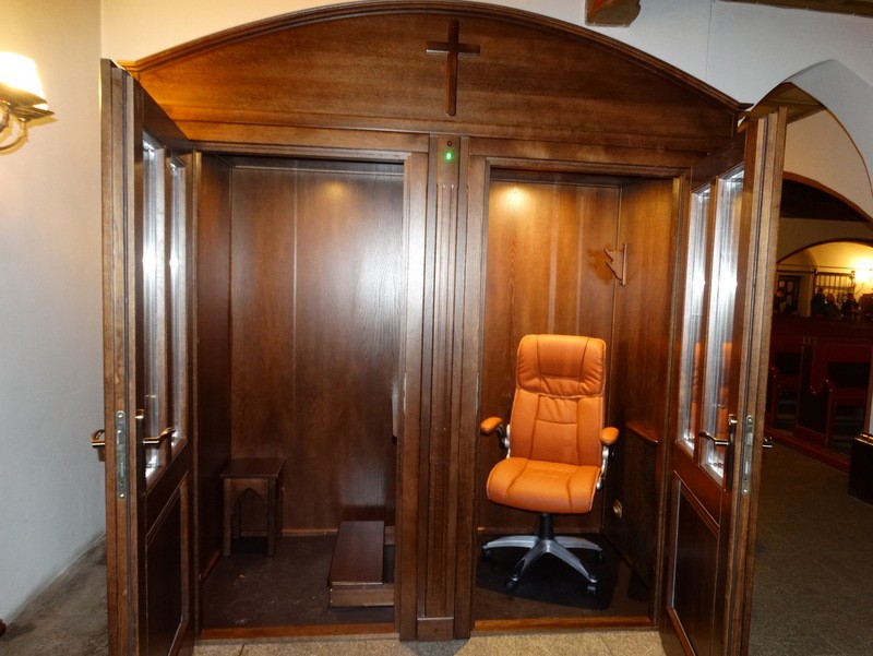 W środku konfesjonału znajdują się dwa wygodne pomieszczenia: dla spowiednika oraz osoby spowiadającej się. Znajdujące się na zewnątrz lampka pokazuje, czy właśnie konfesjonale odbywa się spowiedź.