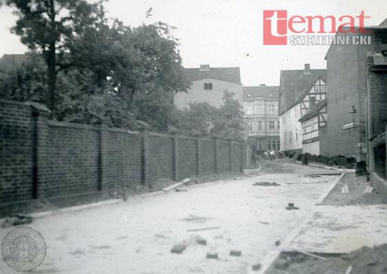 To właśnie w tamtym czasie znikła – widoczna na kolejnym zdjęciu tyle, że z lat 50 - ryglowa zabudowa przy skrzyżowaniu ul. Drzymały z Boh. Warszawy. Ta ostatnia krótko po wojnie nosiła jeszcze swoją dawną nazwę - ul. Królewska, ale bardzo szybko przechrzczono ją na Stalina.