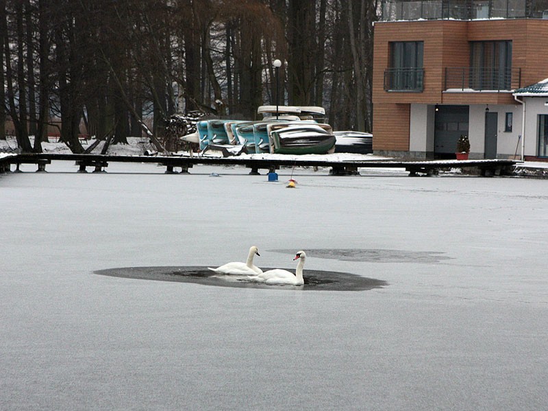 – Podobne telefony odbierają też strażacy. Patrol kilkakrotnie już interweniował, ale ptaki są takie uparte, że po wypłoszeniu ich z niezamarzniętego kawałka jeziora z powrotem do niego wracają.